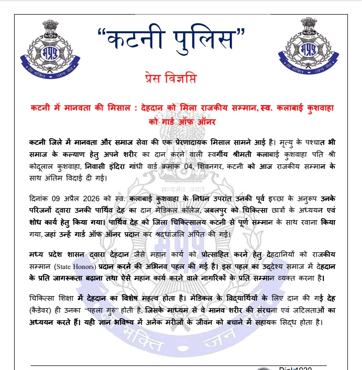 दिनांक 09 अप्रैल 2026 को स्व. कलाबाई कुशवाहा के निधन उपरांत उनकी पूर्व इच्छा के अनुरूप उनके परिजनों द्वारा उनकी पार्थिव देह का दान मेडिकल कॉलेज, जबलपुर को चिकित्सा छात्रों के अध्ययन एवं शोध कार्य हेतु किया गया। पार्थिव देह को जिला चिकित्सालय कटनी से पूर्ण सम्मान के साथ रवाना किया गया, जहां उन्हें गार्ड ऑफ ऑनर प्रदान कर श्रद्धांजलि अर्पित की गई।